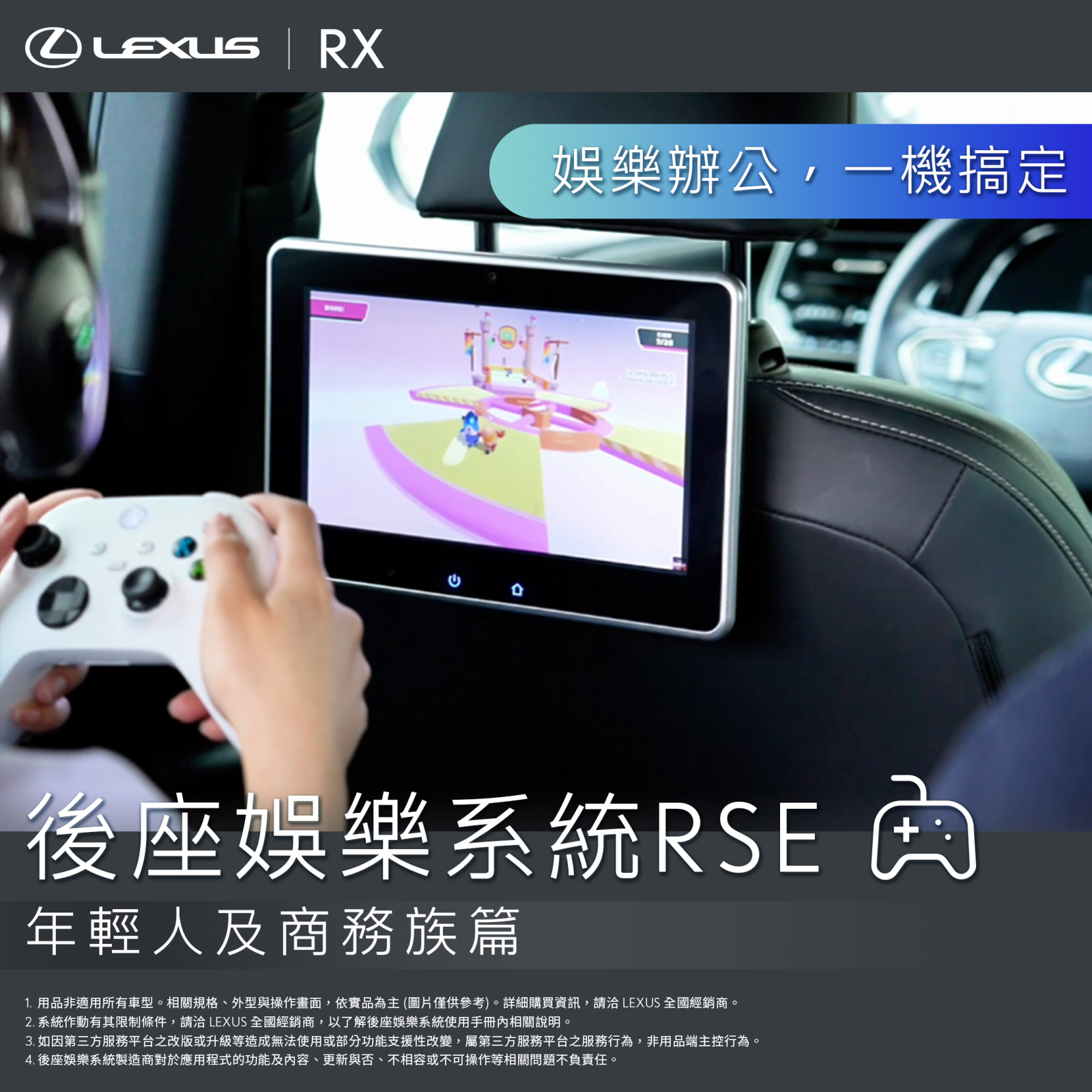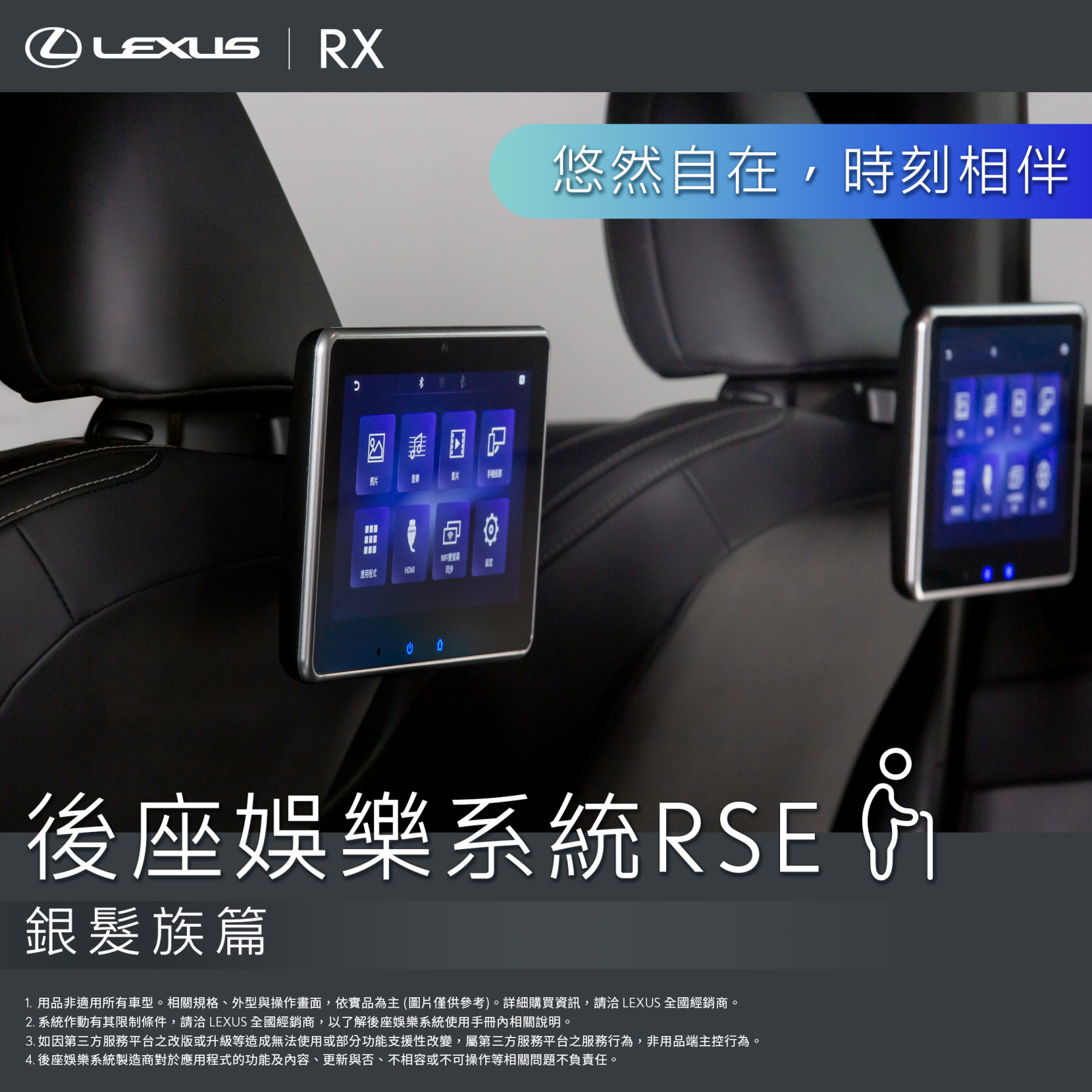 LEXUS RX 全新後座娛樂系統 RSE,將後座升級為專屬移動劇院,在旅途中讓孩子安心追動畫,大人也能自在享受影音娛樂。