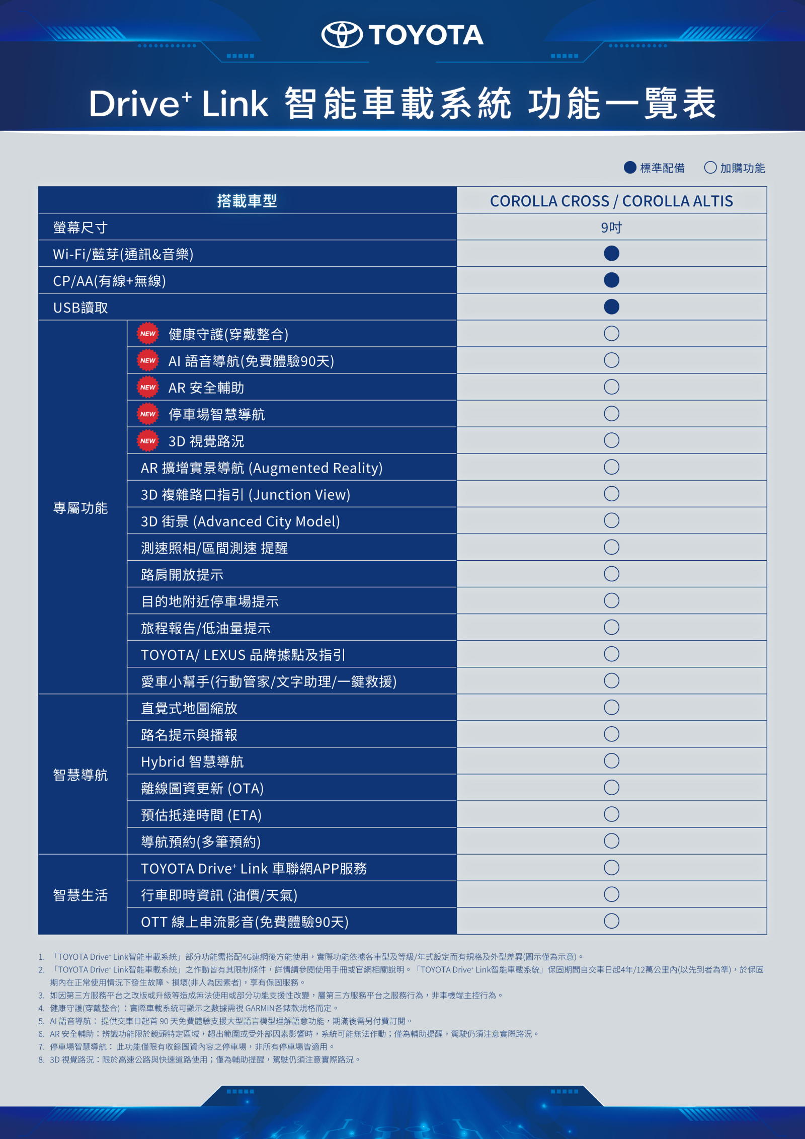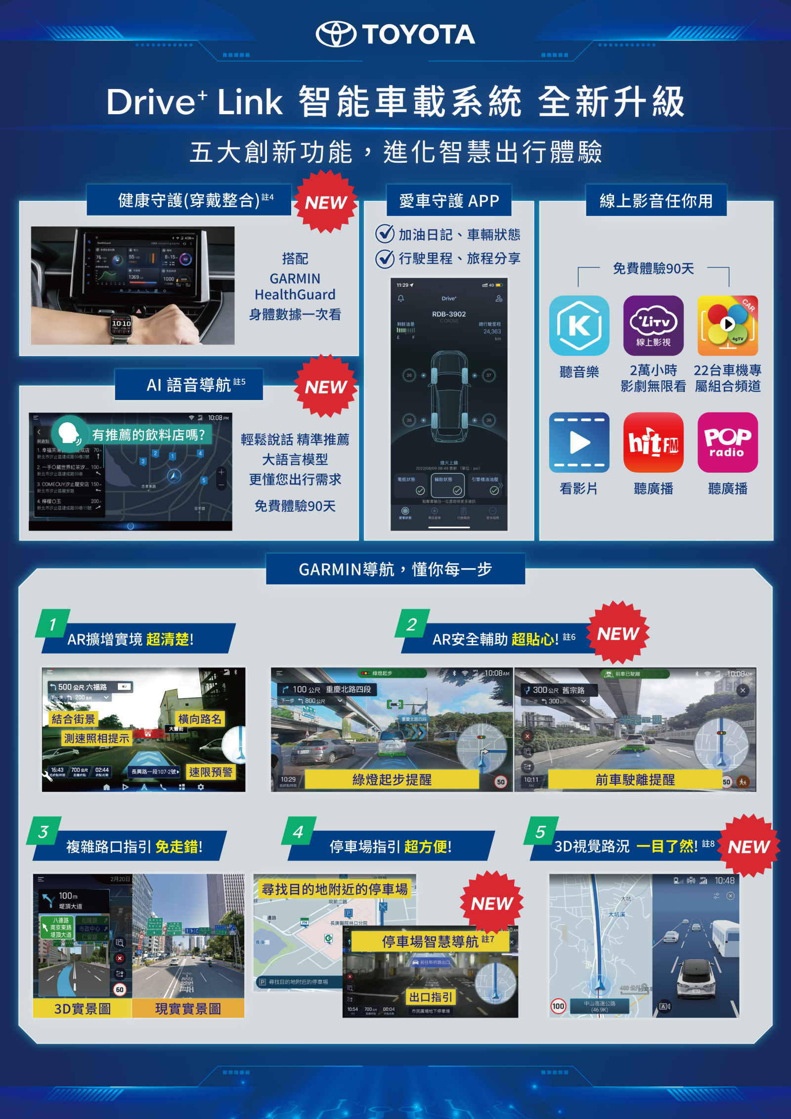 - 「TOYOTA Drive+ Link智能車載系統」之作動皆有其限制條件,詳情請參閱使用手冊或官網相關說明。「TOYOTA Drive+ Link智能車載系統」保固期間自交車日起4年/12萬公里內(以先到者為準),於保固期內在正常使用情況下發生故障、損壞(非人為因素者),享有保固服務。