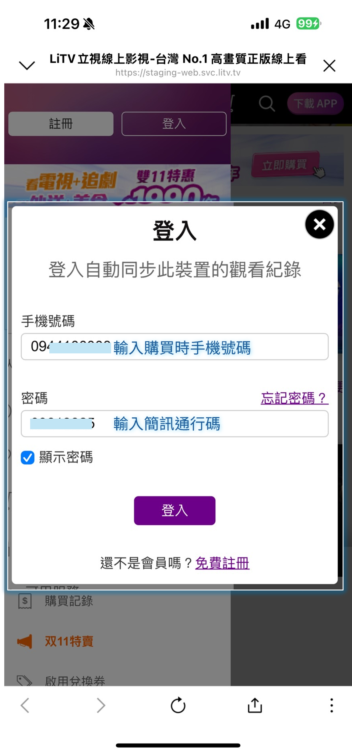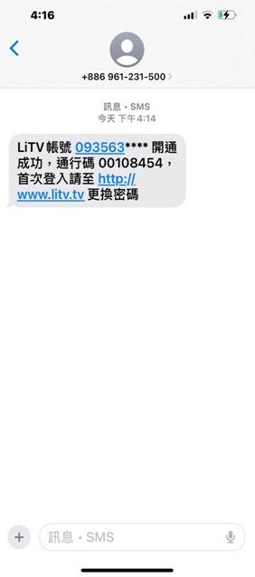 2. 於付款完成後收到兌換通行碼簡訊,前往網址進入 LiTV 網頁。 |