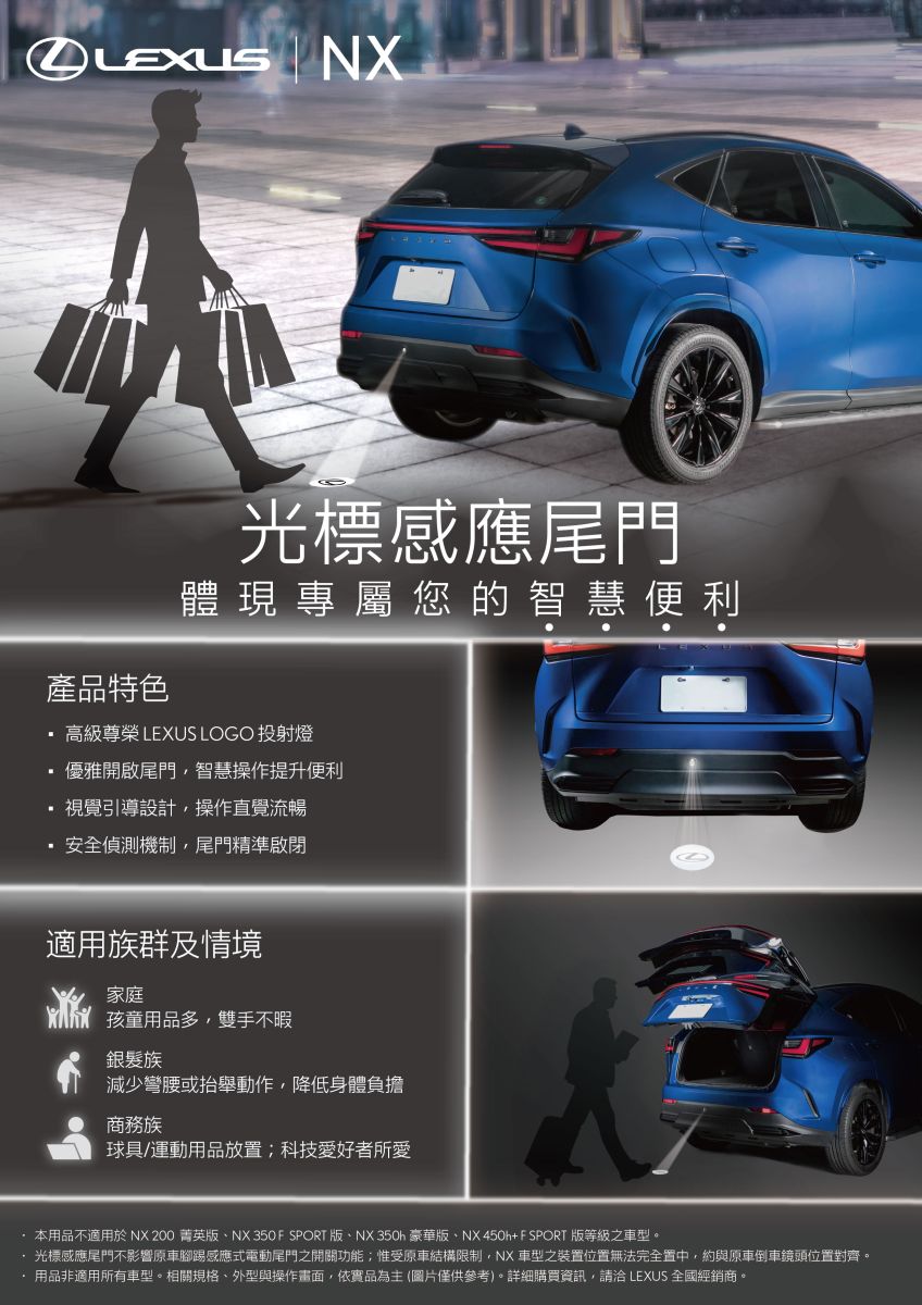 NX 光標感應尾門,透過直覺式感應設計,只要輕輕一踩光標光影,就能自動開啟後車廂;雙手提著年貨、行李或抱著孩子,也能順順完成每一個動作,讓智慧與便利融入每一次的使用。