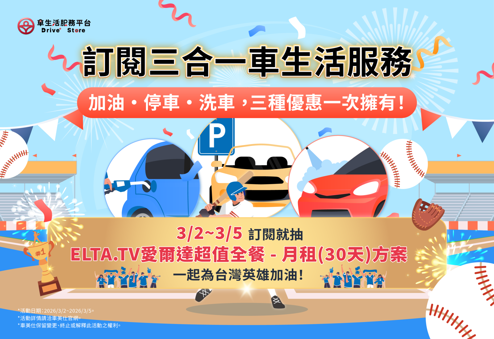 凡於活動期間內(2026/03/02~2026/03/05),訂閱三合一車生活權益,並於結帳時輸入優惠代碼,即可獲得一個抽獎資格。