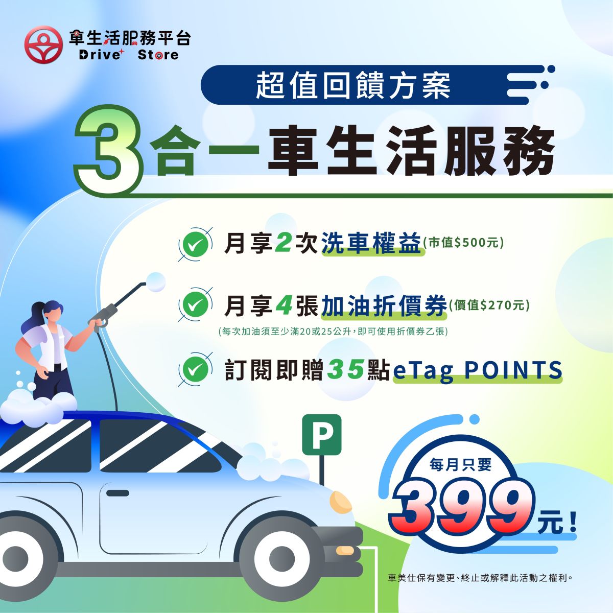 洗車服務:提供價值 500 元的兩次/月洗車服務,全台涵蓋300+以上的加油站洗車據點,讓您出門隨時隨地想洗就洗。