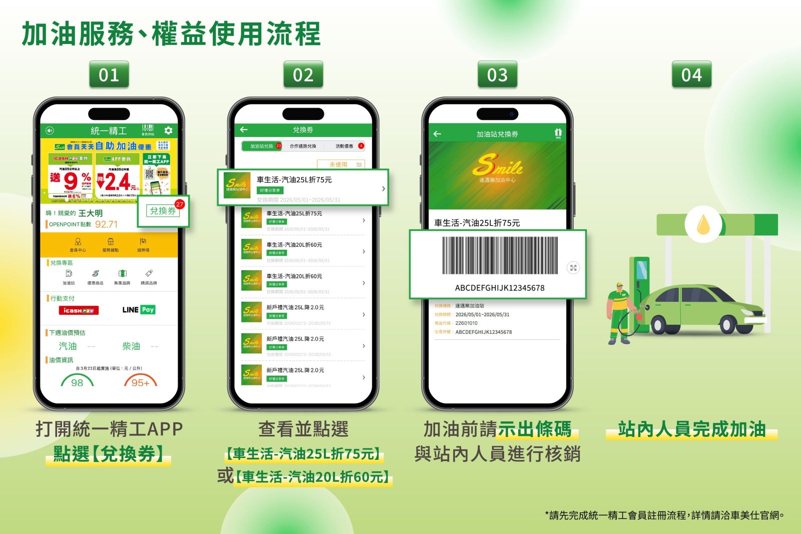 加油服務:訂閱可獲得折價券4張(60元與75元折價券各2張),每次加油滿 20 公升即可用60元折價券;單次加滿25公可使用折價券75元,每次加油,僅可擇一使用折價券,不限平假日。(註解:僅限人工加油以及汽油服務)