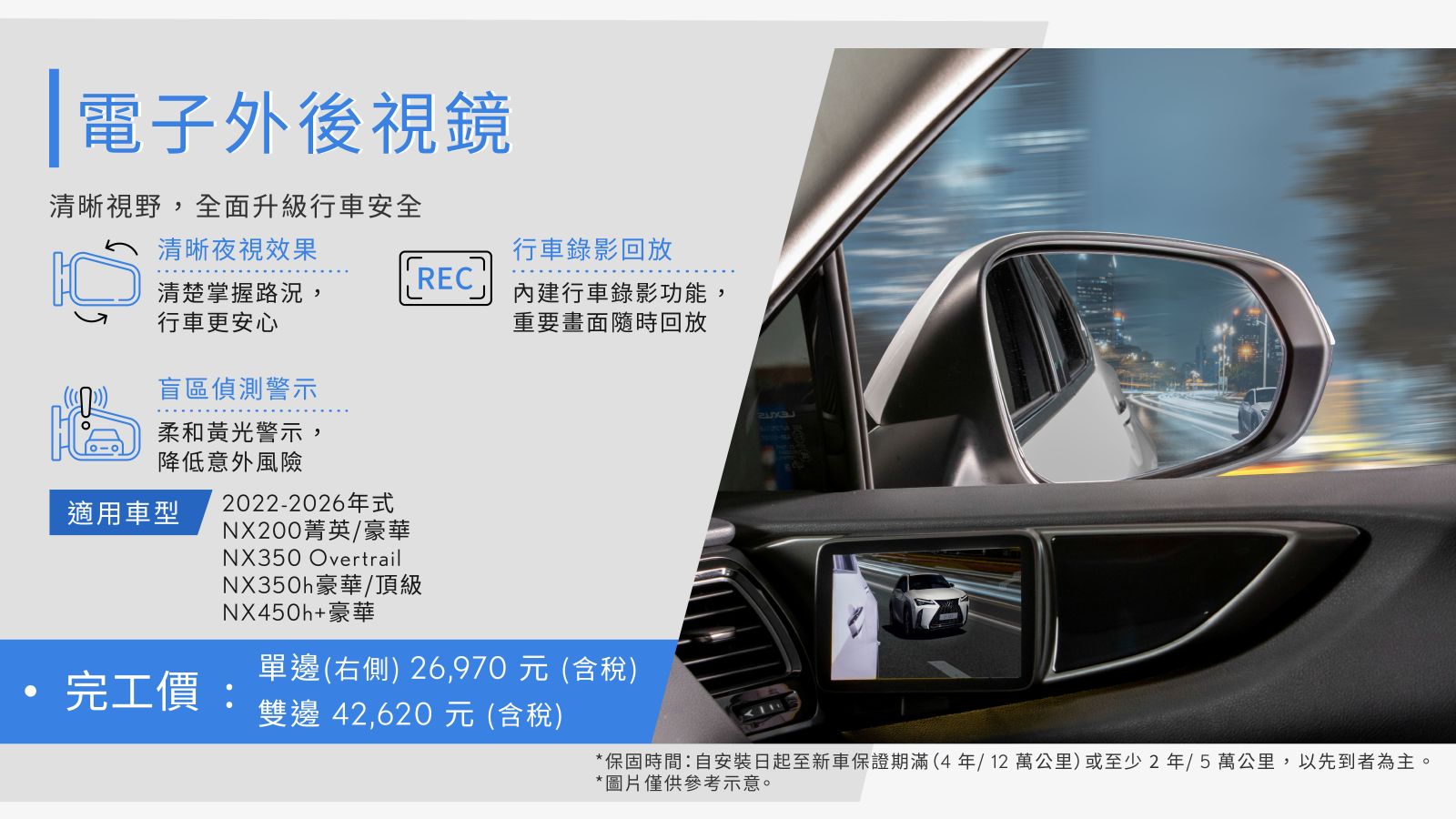 *本DM商品保固期限為自安裝日起至新車保固期滿(4年/12萬公里)或至少2年/5萬公里,以先到者為準。