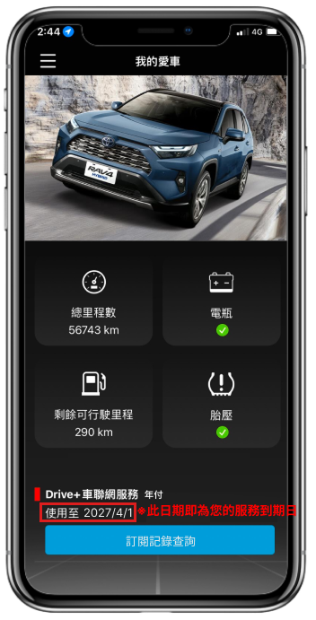 2026年4月1日起,僅停止受理 Drive+ Connect 車聯網服務之「續約」,並非所有車聯網服務全面終止。於服務有效期間內,車主仍可持續使用原有服務至效期結束。您可至 Drive+ Connect 智能車載系統 APP中的「我的愛車」頁面,於下方查看「車聯網服務效期日」,即可確認目前服務有效期限。
