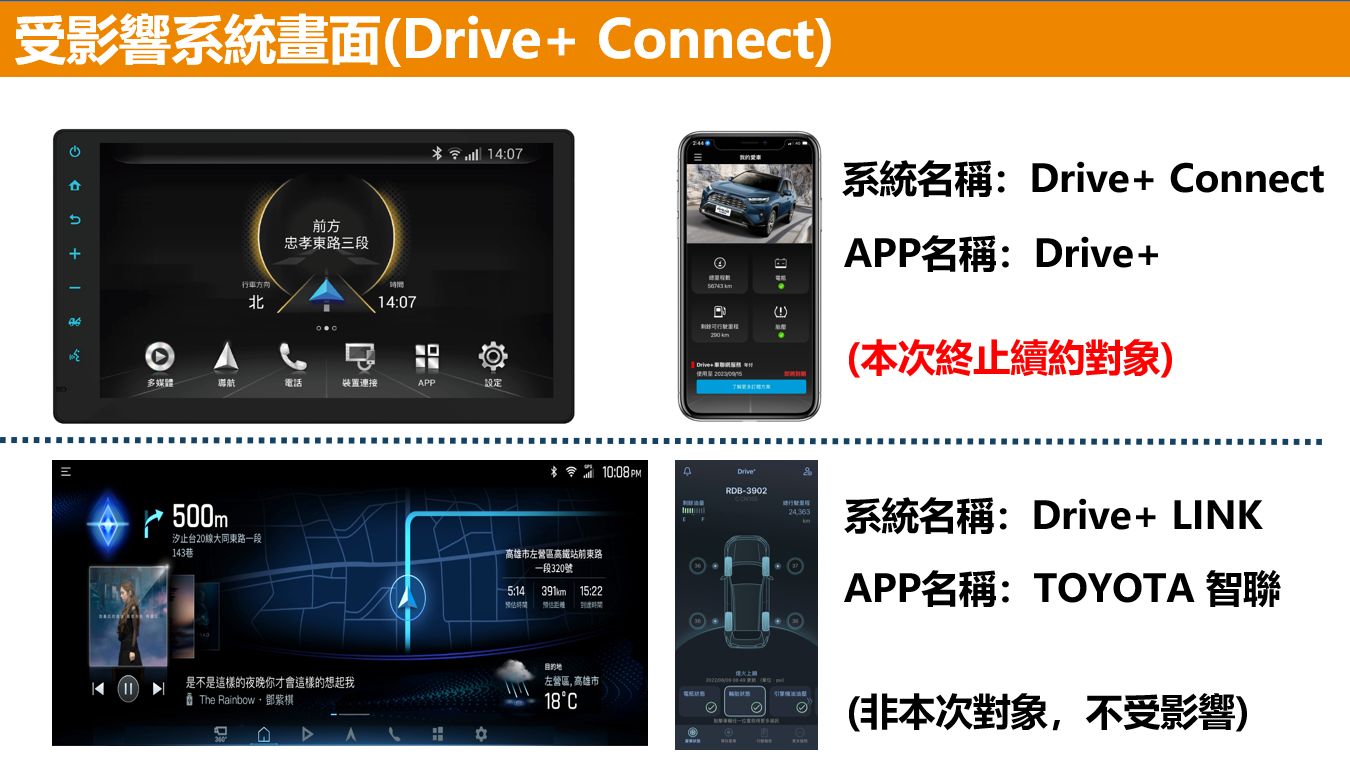 本次「續約服務終止」僅影響搭載 Drive+ Connect(搭配「Drive+」APP) 之車輛。